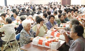 宮古はお年寄り(先輩)を敬い大切にする気持ちが本当に強い。敬老会は今の豊かな地域、宮古、沖縄県、日本を、苦労を重ね切り開き作り上げてきた大先輩たちを敬う会なのだ。敬老会には市町村長が祝いに駆けつけるのは当然のこと、地域を挙げて盛大に長寿と健康をお祝いする。