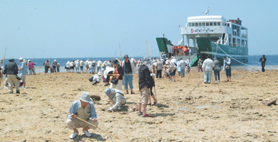 海面に浮き上がった幻の大陸に上陸する観光客ら