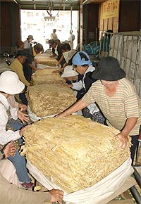 この取扱所には宮古中の葉タバコが一気に集まってくる。約一カ月もの間、農家が一生懸命作った葉タバコが毎日搬入され、厚い布で囲われた検品場でJTの検査員が袋に詰まったタバコ葉を手で触り、香りを確かめ、葉をめくり上げては中にある葉の色など細かくチェックする。