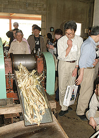 サトウキビが圧搾機にかけられジュースを取る様子を見る見学者ら=下地の黒糖工場で